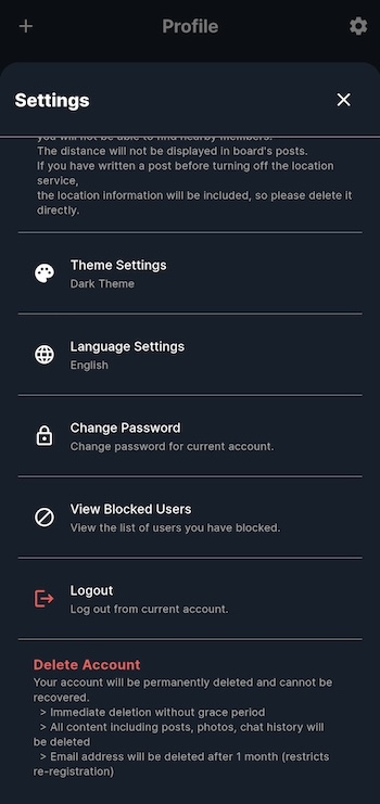③ Follow the instructions to complete the deletion, and all posts and chat history will be immediately deleted.