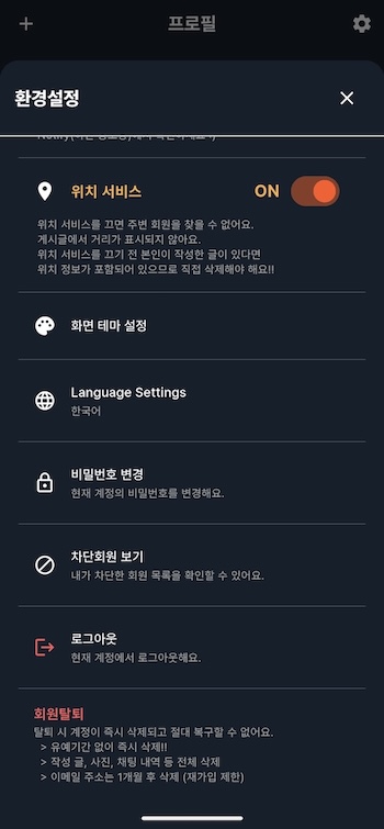 ② 환경설정 화면의 제일 하단에 있는 '회원탈퇴' 버튼을 클릭합니다.